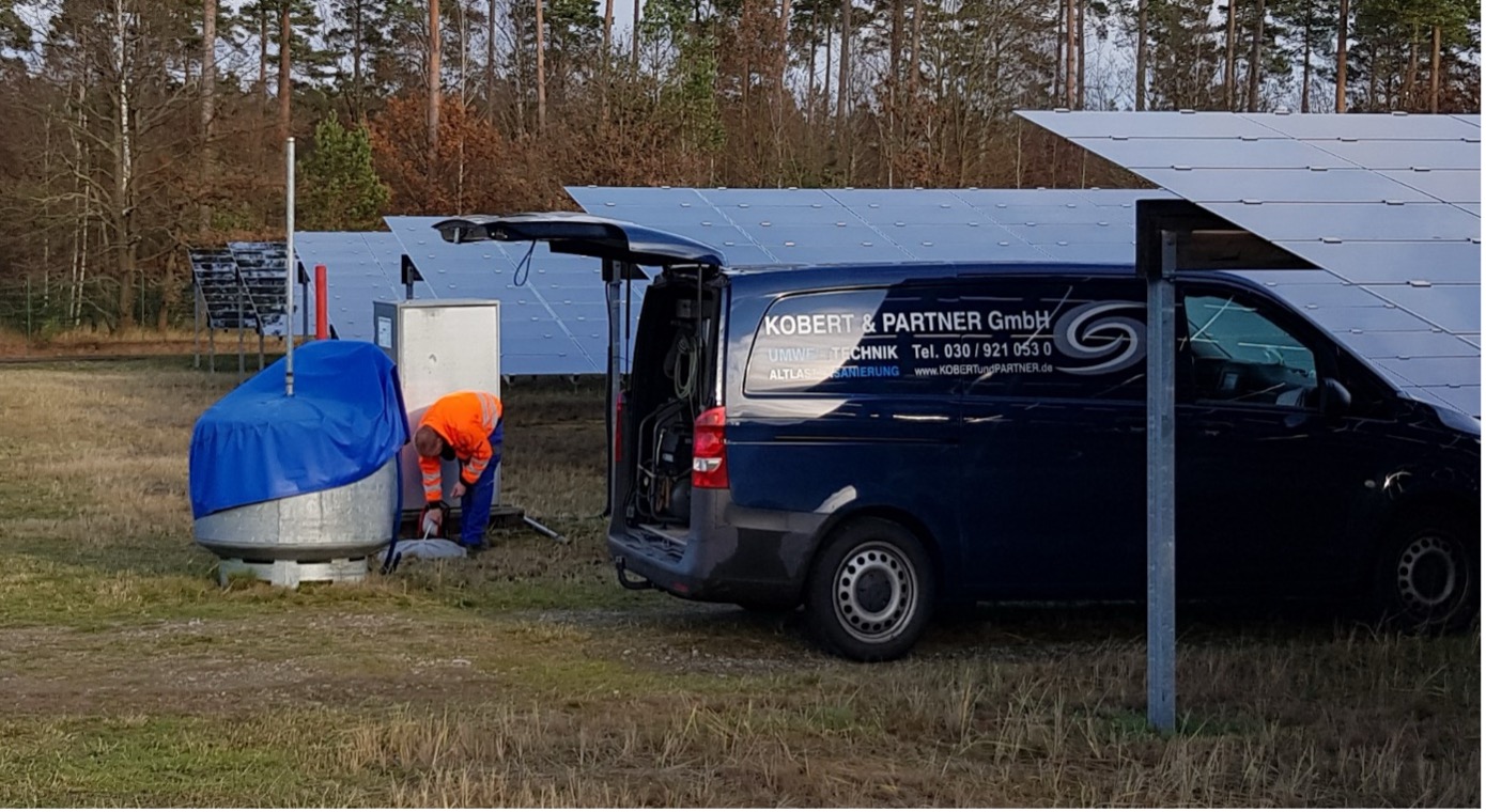 Die Firma Kobert & Partner wurde mit der Installation der Ölabsaugtechnik beauftragt. An 26 Standorten, mitten in einem über 200 Hektar großen Solarfeld, wurden 35 Brunnen mit den automatischen Ölsammlern bestückt. Diese ermöglichten eine zuverlässige Absaugung der auf dem Grundwasser schwimmenden Kerosinphasen. Teilweise konnten so pro Brunnen und Tag mehr als 100 Liter Kerosin gefördert werden. Bisher konnte durch diese Maßnahme eine außergewöhnlich hohe Schadstoffentfernung von über 900.000 Litern Kerosin erreicht werden.